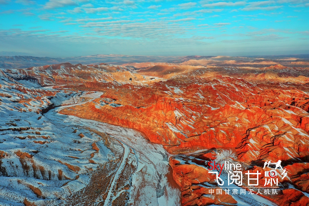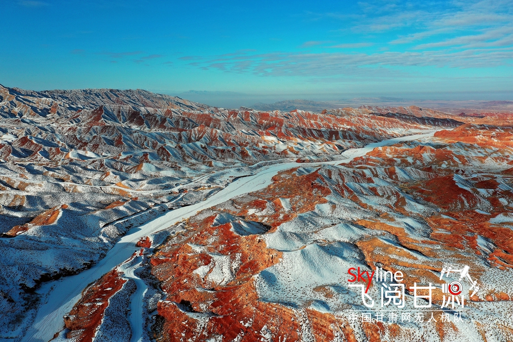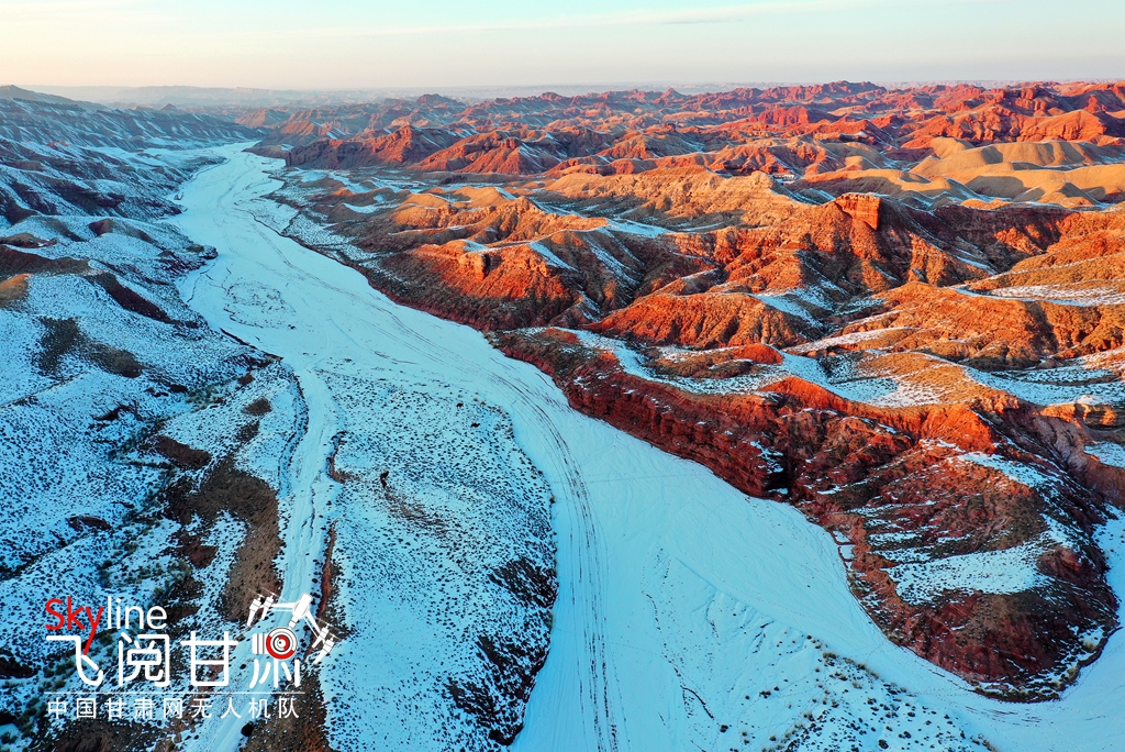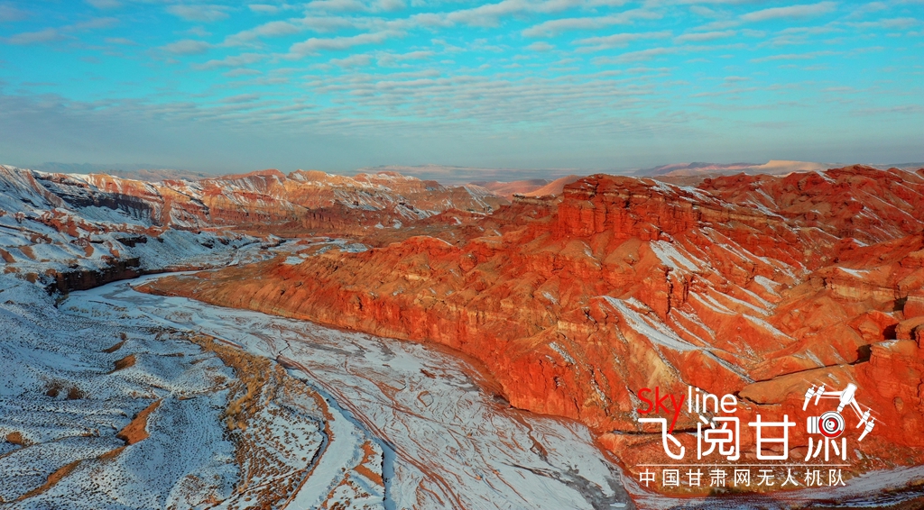 12月15日,雪霽初晴的甘肅省張掖平山湖大峽谷,丹山赤壁與皚皚冰雪交相輝映,分外美麗。(無人機照片)