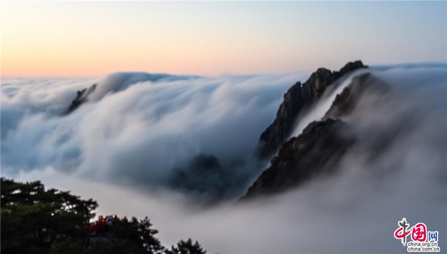 凌晨,當(dāng)云海隨著氣流漫過天都峰與蓮花峰時瘋狂的傾瀉而下,浩浩蕩蕩直奔東方注入大海,成就浩瀚的海洋。