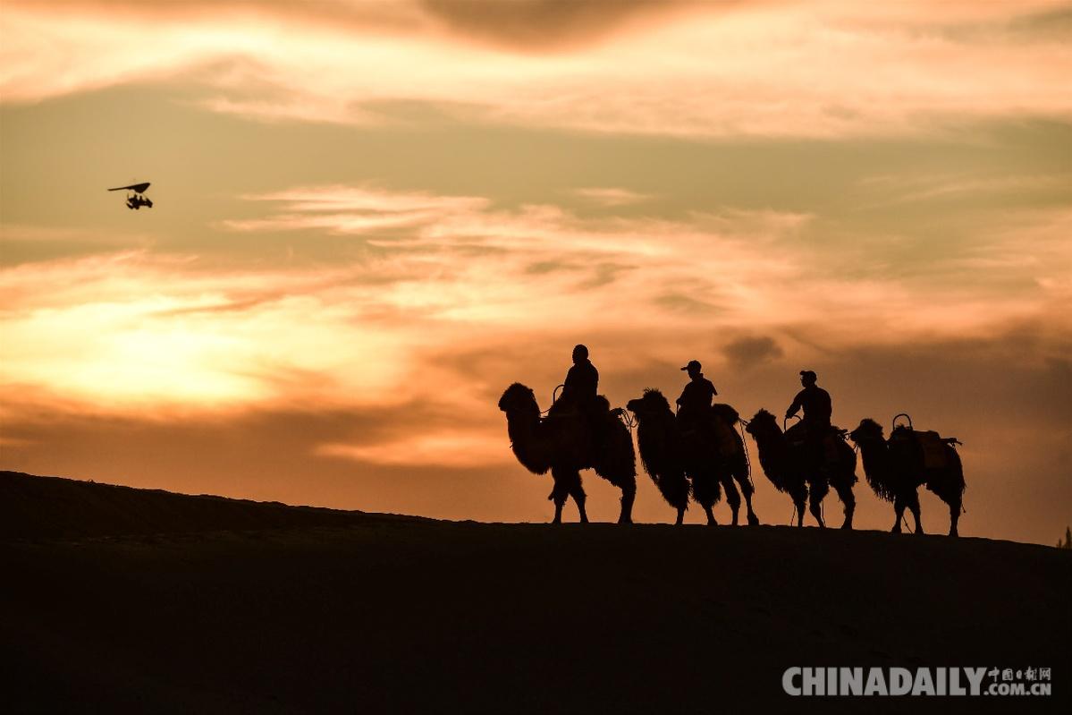 5月6日,游客乘坐滑翔機從空中鳥瞰敦煌大漠風光。