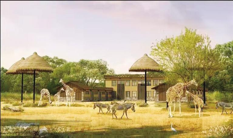 非洲草原區(qū)籠舍和展館主要位于中心位置,建筑風(fēng)格以非洲部落建筑形式為主,體現(xiàn)非洲原始部落生活風(fēng)貌。這里有狒狒館、鬣狗館、非洲草原混養(yǎng)區(qū)(長頸鹿和斑馬籠舍、羚羊館)河馬館和黑猩猩館。