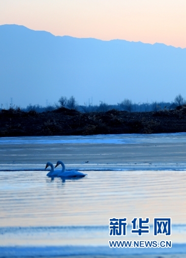2022年1月2日,晨曦初露的甘肅省張掖市甘州區(qū)黑河流域,一群大天鵝在河中棲息、覓食,宛如一幅靜美的畫卷。新華網(wǎng)發(fā)(楊永偉 攝)