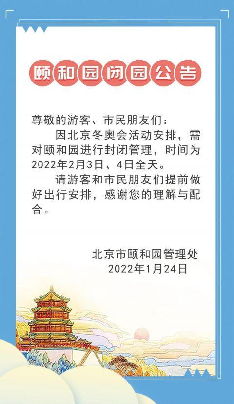 北京市頤和園管理處發(fā)布消息稱,為配合北京冬奧會(huì)活動(dòng)安排,2月3日、4日全天頤和園景區(qū)將全園閉園。