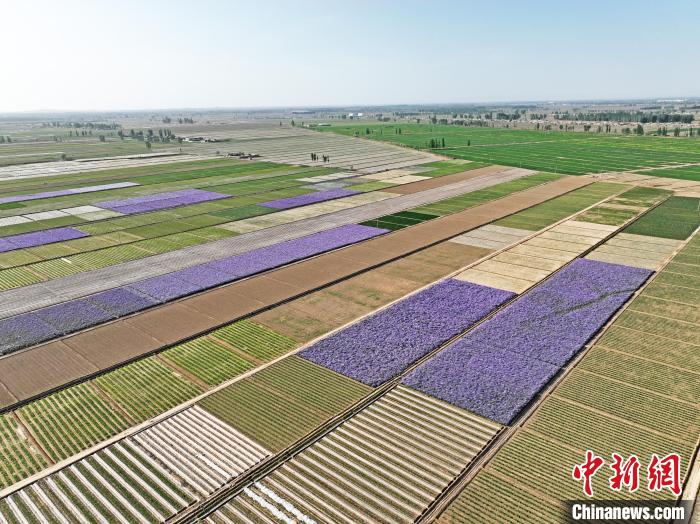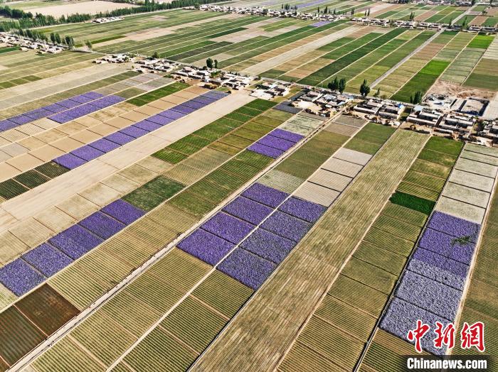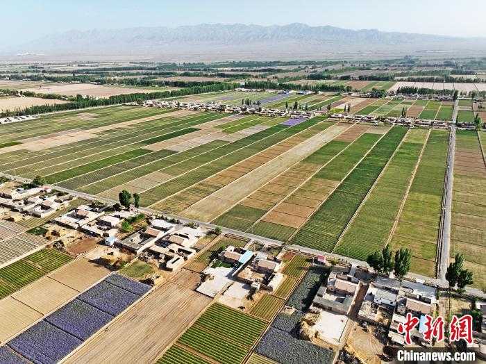 夏日時節(jié),甘肅省張掖市高臺縣駱駝城鎮(zhèn)紅新村和梧桐村的田野間,農舍青青、遍野吐翠,阡陌縱橫間五彩斑斕,構成一幅美麗的田園風光畫。