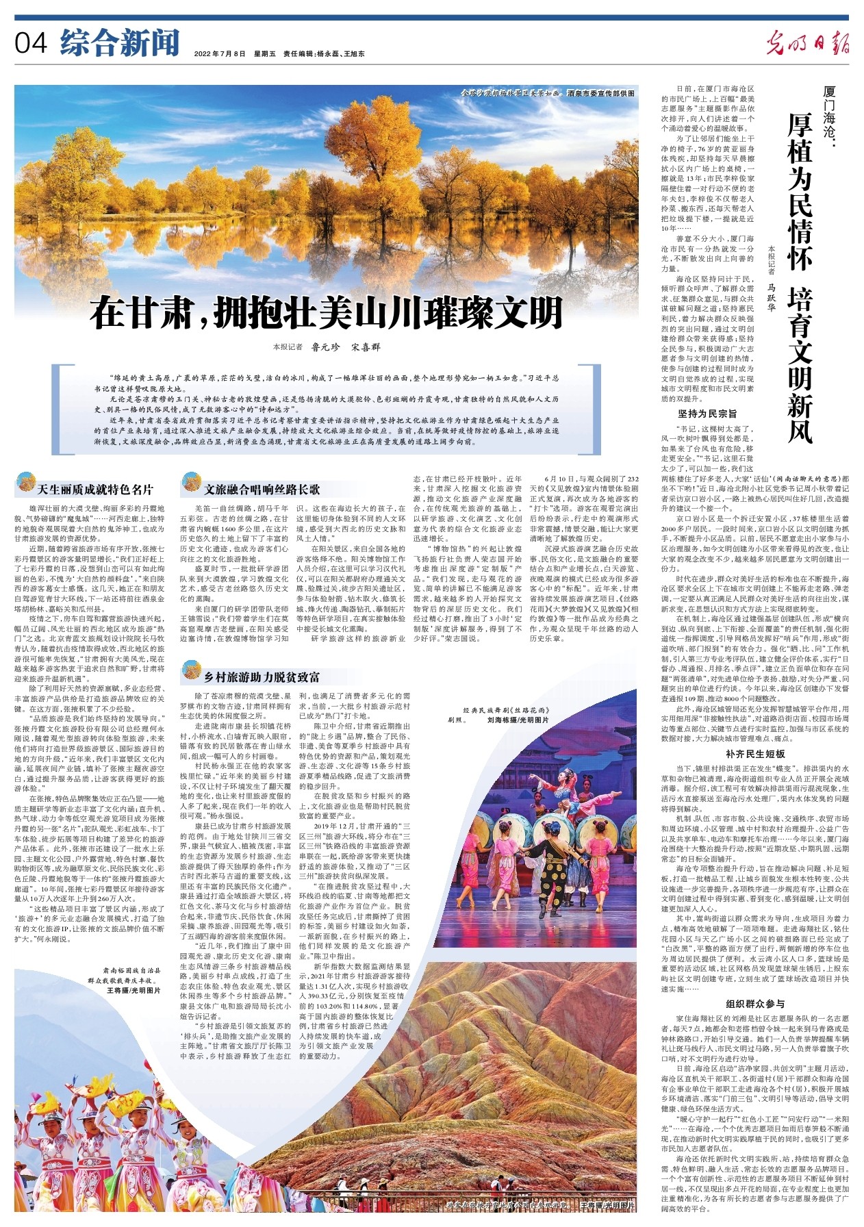 “鄉(xiāng)村旅游是引領(lǐng)文旅復(fù)蘇的‘排頭兵’,是助推文旅產(chǎn)業(yè)發(fā)展的主陣地。”甘肅省文旅廳廳長陳衛(wèi)中表示,鄉(xiāng)村旅游釋放了生態(tài)紅利,也滿足了消費者多元化的需求,當(dāng)前,一大批鄉(xiāng)村旅游示范村已成為“熱門”打卡地。
