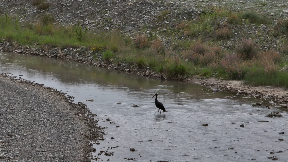 一只黑鸛在河中覓食。(天祝藏族自治縣委宣傳部供圖)