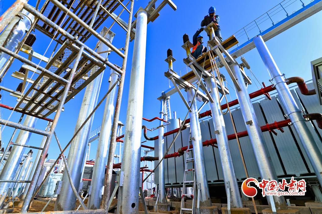 11月17日,甘肅省張掖市甘州區(qū)南灘中能綠電南灘30萬千瓦光伏建設(shè)現(xiàn)場,工人們正在進行變電設(shè)備安裝。