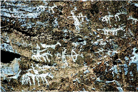 肅北縣大黑溝巖畫是全國重點文物保護(hù)單位,巖畫形成時間初步斷定在春秋、戰(zhàn)國至西漢時期,位于肅北縣城東約40公里處的大黑溝。巖畫共有34組,圖案190多幅,零亂分布在3.5公里長的山溝中,畫面內(nèi)容多為射獵、放牧、練武、乘馬作戰(zhàn)等場景和北山羊、野牛、野駱駝等動物,畫面表現(xiàn)形式多以凹刻和凸刻,巖畫大多刻在避風(fēng)向陽的陡峭花崗巖和石灰石上。