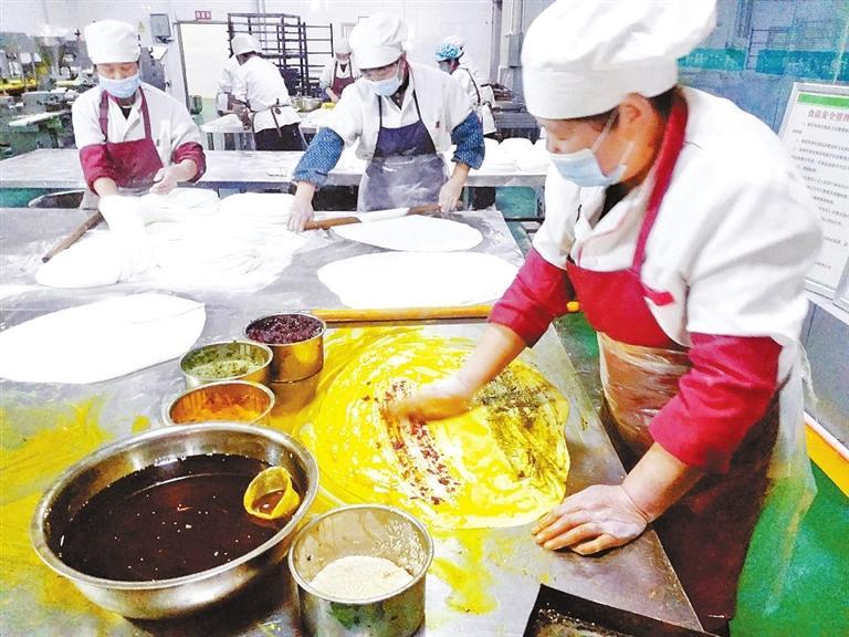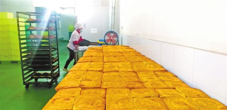“揉面、搟面、抹餡料……”手工制作線上一位大姐告訴記者:“目前我們有手工生產(chǎn)和全自動生產(chǎn)兩條線,分別生產(chǎn)千層餅傳統(tǒng)面點和玫瑰餅等新型糕點。傳承祖上燒餅制作技藝,工人們要在前一晚和好面,面團經(jīng)過一夜的醒發(fā)后,天剛亮再交由經(jīng)驗老到的師傅打堿,揉面、搟面,涂抹苦水玫瑰醬、胡麻顆粒、香豆粉、姜黃粉等餡料,卷制成型,在千層餅正面撒上芝麻,就可以上烤箱了,大約每天上午10點前烘烤好的千層餅會送往永登各銷售點。”