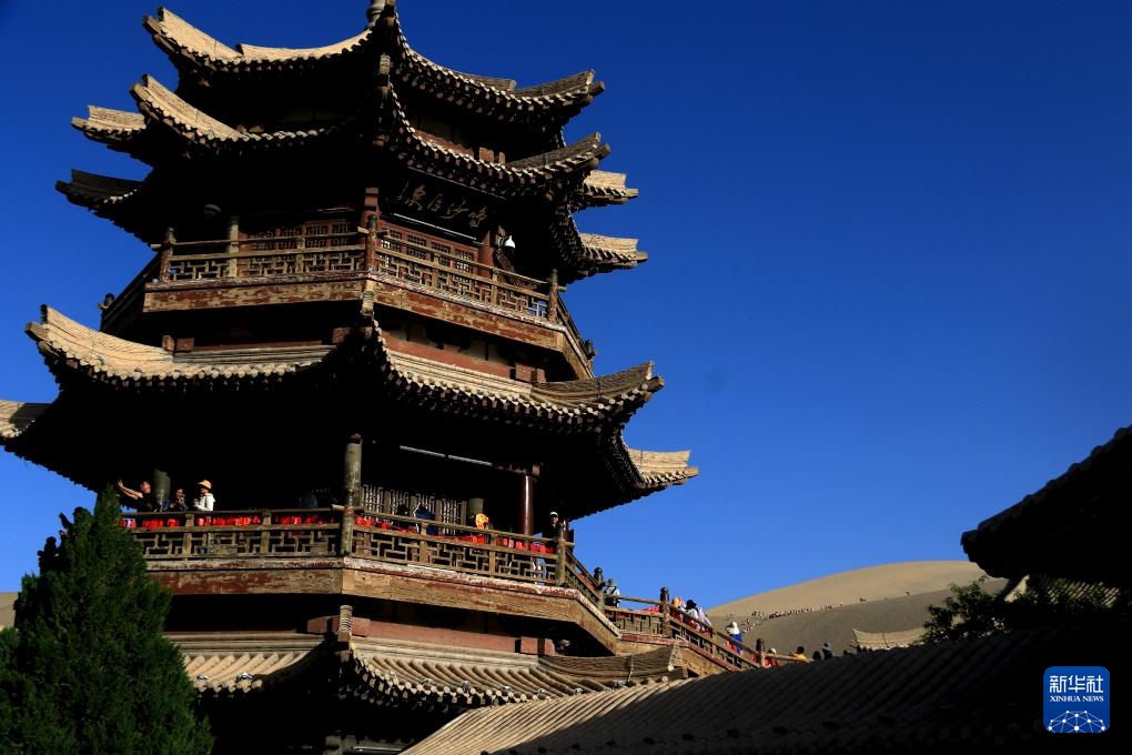初秋時(shí)節(jié),甘肅省敦煌市碧空如洗,鳴沙山月牙泉景區(qū)景色如畫,引人入勝。