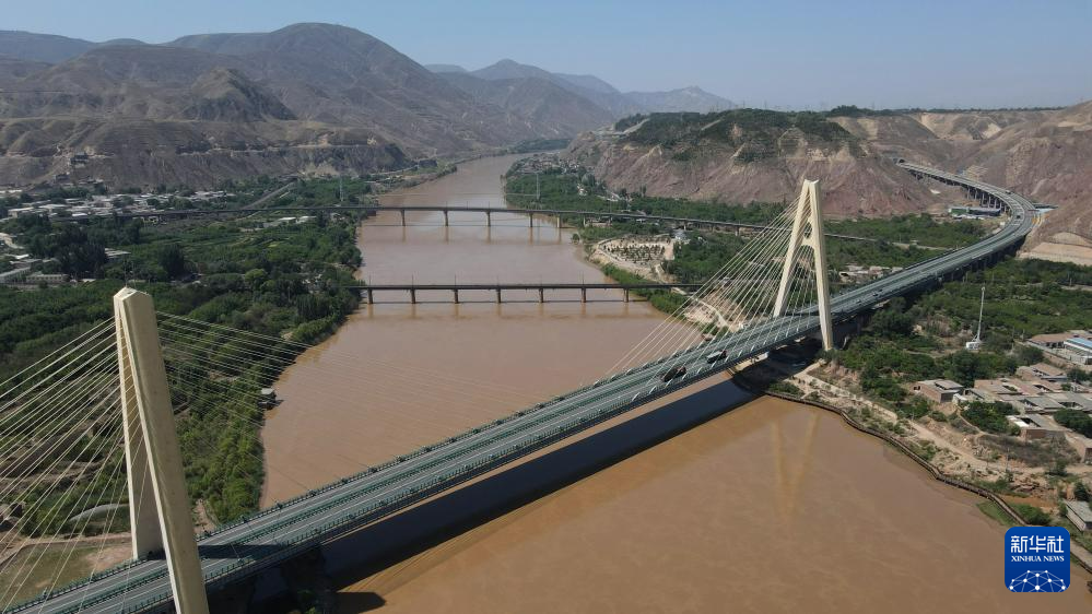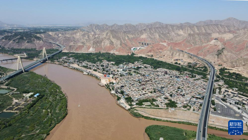 緊鄰甘肅省蘭州市西固區(qū)河口古鎮(zhèn)的高速公路大橋橫跨黃河(7月9日攝,無人機(jī)照片)。新華社記者 張可任 攝