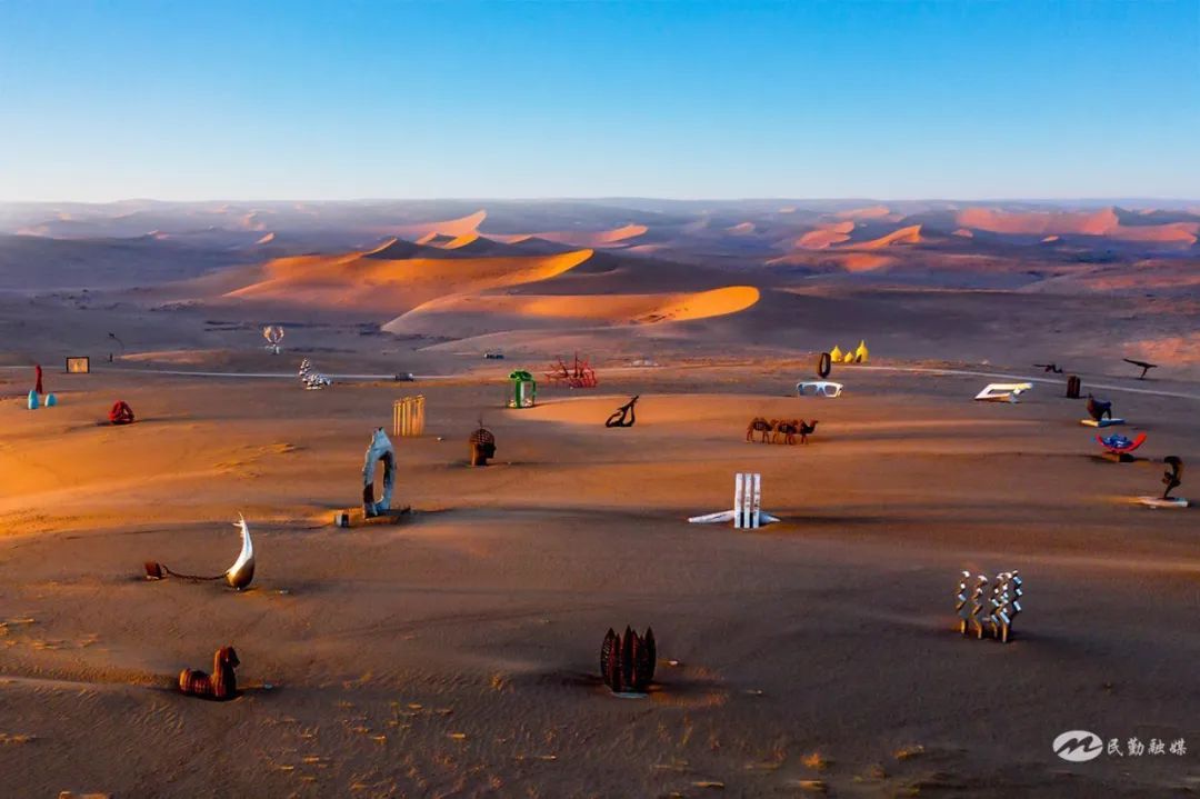 民勤蘇武沙漠景區(qū)絕對是網(wǎng)紅般的存在。刷屏各平臺它已成為???,沙漠雕塑國際創(chuàng)作營是大家最愛的拍照打卡地,132座不同材質(zhì)、不同風(fēng)格的藝術(shù)佳作,如一顆顆璀璨明珠飄落瀚海,與藍(lán)天白云、金色大漠完美融合、相映成趣,超級出片。