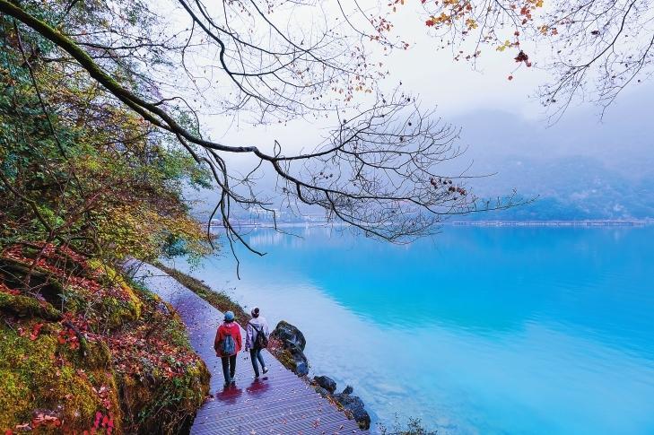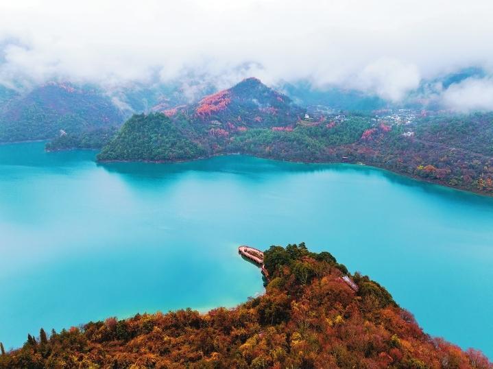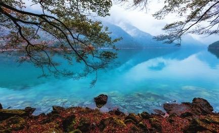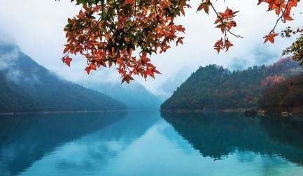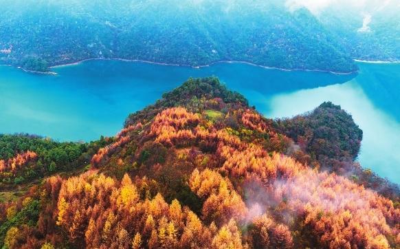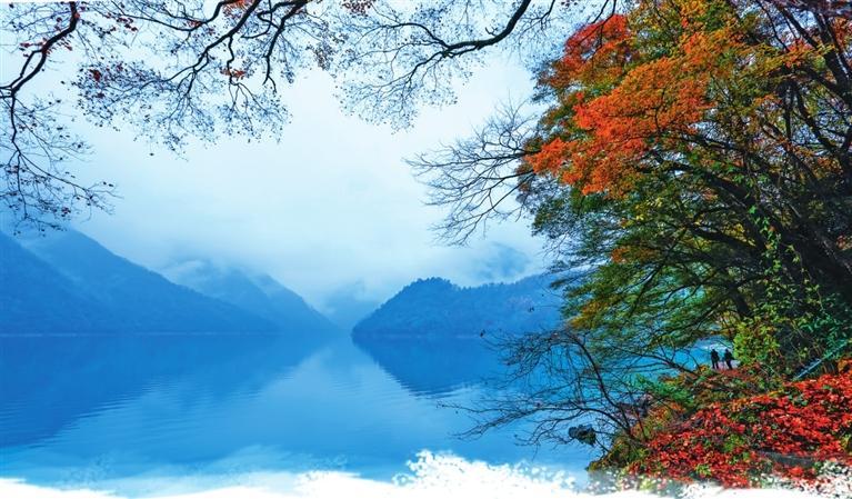 初冬時節(jié),文縣天池國家森林公園尚未褪去秋裝。遠山峰巒疊嶂,層林色彩斑斕,近水沉斂如鏡,林木倒映其間。黃葉悄落,波紋漣漪,云霧時起,水霧彌漫。初冬的天池,靜美如畫卷。