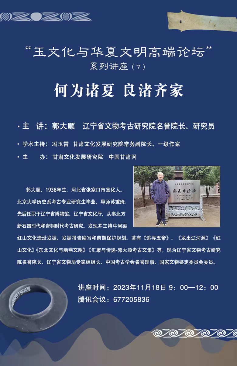 11月18日上午,遼寧省文物考古研究院名譽院長、遼寧省文物局專家組組長、中國考古學會常務(wù)理事郭大順研究員在線上做了題目《何為諸夏,良渚齊家》的學術(shù)報告。這是甘肅文化發(fā)展研究院和中國甘肅網(wǎng)聯(lián)合舉辦的“玉文化玉華夏文明高端論壇”系列講座第五講,由甘肅文化發(fā)展研究院常務(wù)院長、一級作家馮玉雷主持,西北師范大學公選課《中國玉文化》學子及鄧淑蘋、薛新明、徐琳、王方、韓斝等玉學家參會并討論。