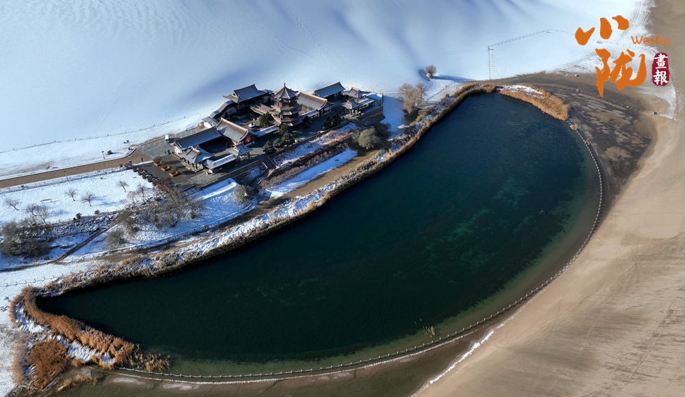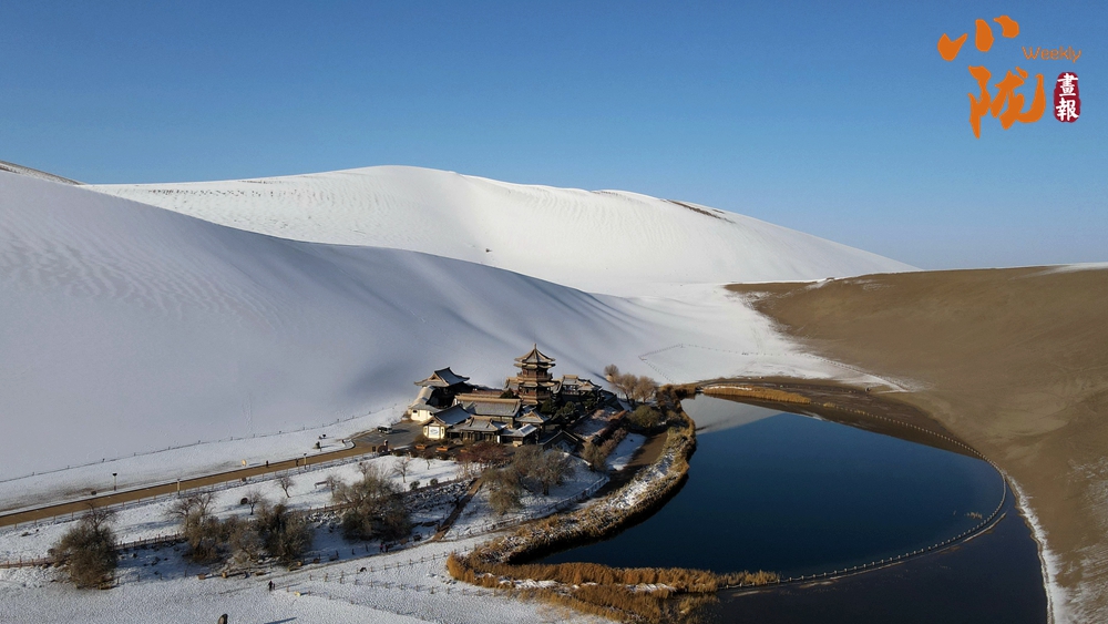 敦煌下雪之后,一半沙漠一半雪。冬日暖陽(yáng)下,月牙泉像一面鏡子,將沙漠映照得更為浪漫,讓人產(chǎn)生無(wú)限遐想。