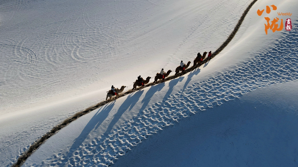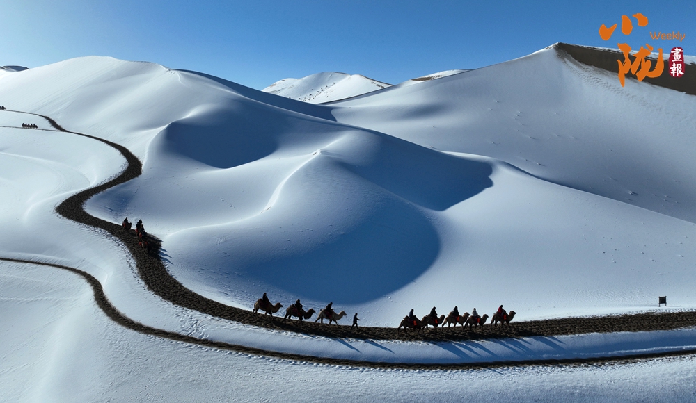 鳴沙山上,連綿不絕的沙海披上銀裝,放眼望去,如詩(shī)如畫(huà),美不勝收,吸引了不少游客騎著駱駝踏雪賞景。