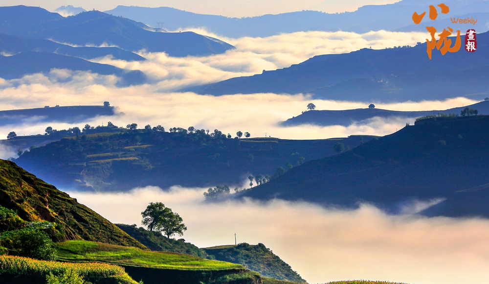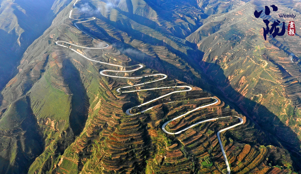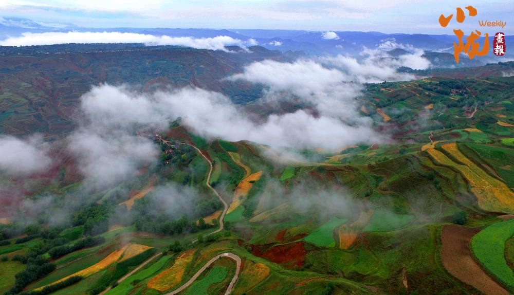 在旅游大通道積石山段遠(yuǎn)眺,云霧穿山飄過,遠(yuǎn)處的村莊和梯田時隱時現(xiàn),遠(yuǎn)山近嶺,草樹煙村......置身其中,仿佛步入了人間仙境。