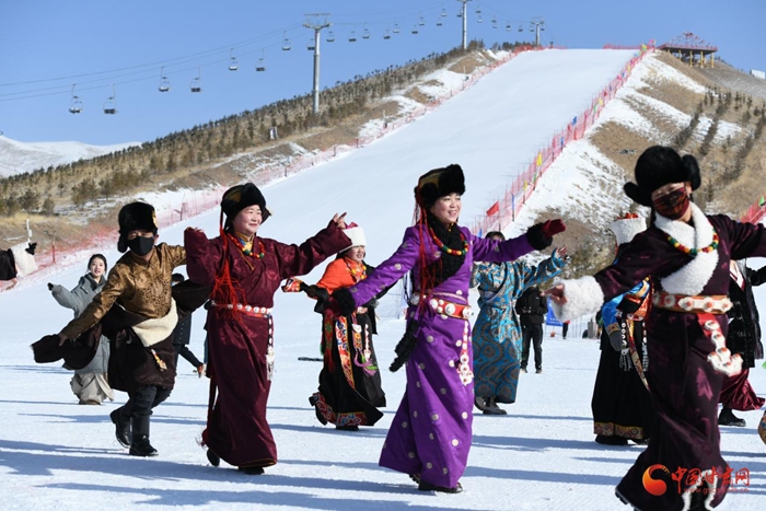 銀裝素裹的“冰雪嘉年華”現(xiàn)場,來自當?shù)氐母刹咳罕娚碇?jié)日的盛裝和游客們一起,隨著音樂的旋律,跳起了鍋莊。游玩區(qū),大人小孩參與其間,體驗雙板滑雪、雪圈、雪地自行車等多種娛樂項目,歡聲笑語彌漫著整個雪場。