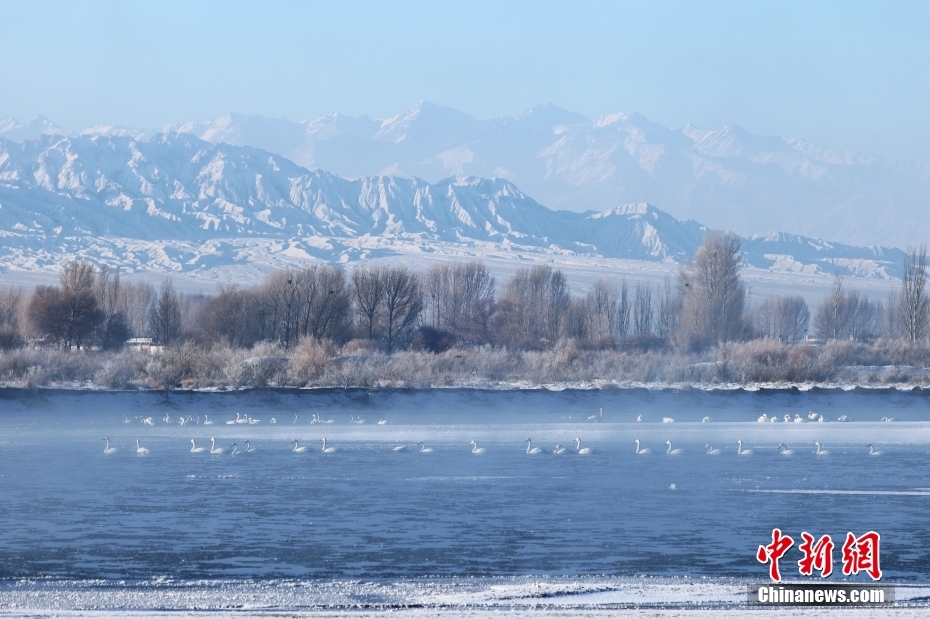 1月21日清晨,甘肅張掖市黑河國家級自然保護(hù)區(qū),受低溫影響,黑河水面霧氣氤氳縹緲,天鵝在水中暢游,野鴨等候鳥在空中飛舞,宛如一幅水墨生態(tài)畫卷。圖/CNSphoto 成 林 攝