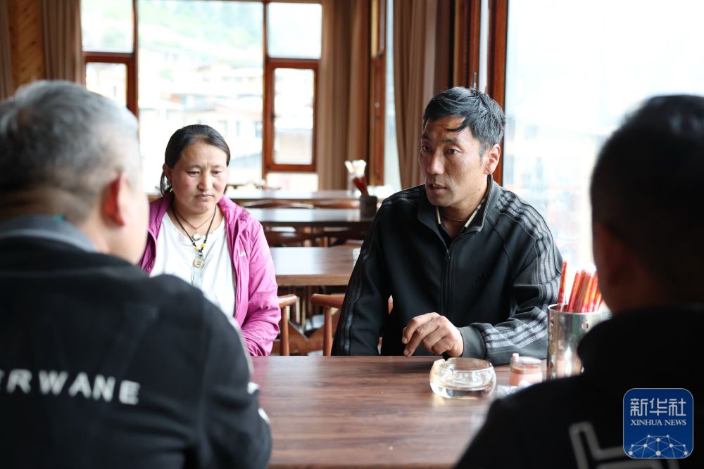 ↑ 扎尕那景區(qū)一家民宿經(jīng)營(yíng)者卓瑪交(右)在自家的民宿里和員工交流如何提高服務(wù)水平(6月27日攝)。新華社記者 方欣 攝
