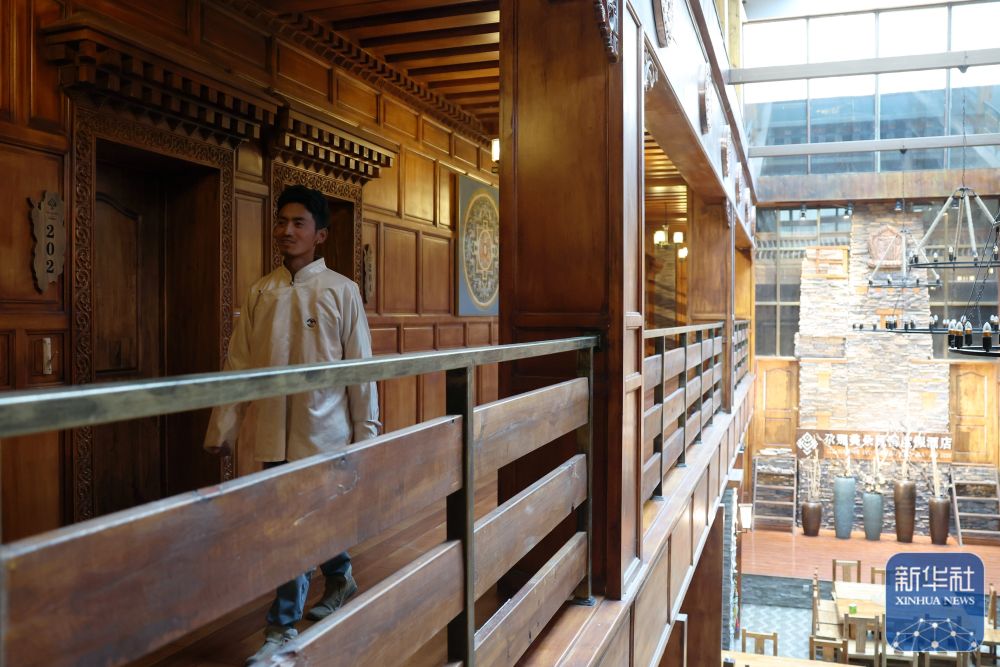 ↑ 扎尕那村一家民宿工作人員仁青從民宿走廊里走過(guò)(6月27日攝)。新華社記者 陳斌 攝