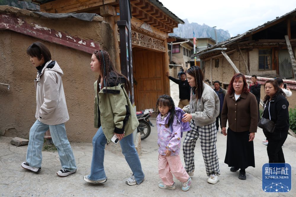 ↑ 扎尕那村一家民宿工作人員仁青(右)幫助前來(lái)住宿的游客搬運(yùn)行李(6月27日攝)。新華社記者 陳斌 攝