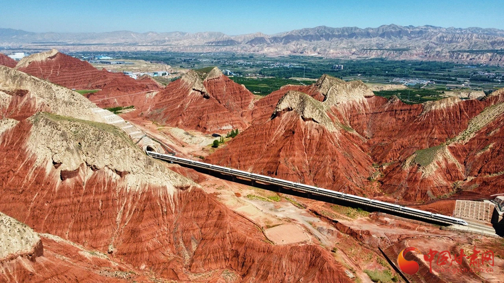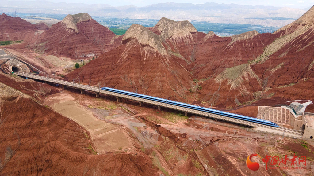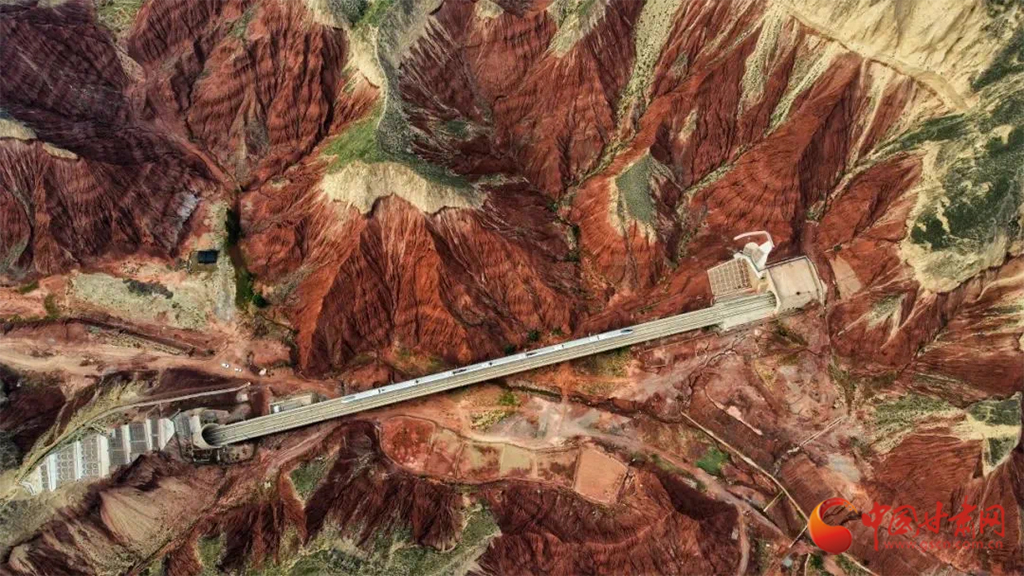 朝家山隧道位于蘭州市紅古區(qū)和青海省民和縣交界處,是蘭新高鐵西出蘭州必經(jīng)之地。在這里,通體呈紅色的丹霞地貌在湛藍天空下越發(fā)顯得艷麗奪目,列車穿越七彩丹霞,風(fēng)景如畫風(fēng)光無限好。