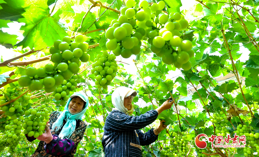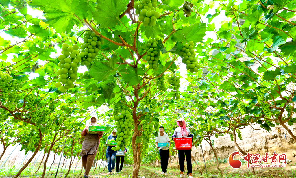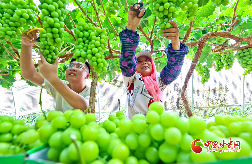 8月28日,在高臺縣南華鎮(zhèn)智號村1000畝陽光玫瑰葡萄綠色標(biāo)準(zhǔn)化產(chǎn)業(yè)園內(nèi),40多萬斤陽光玫瑰進(jìn)入成熟采摘期,果農(nóng)們正在采摘、分揀、裝箱,準(zhǔn)備發(fā)往浙江、江蘇、新疆、青海、內(nèi)蒙古等地客商的手中。