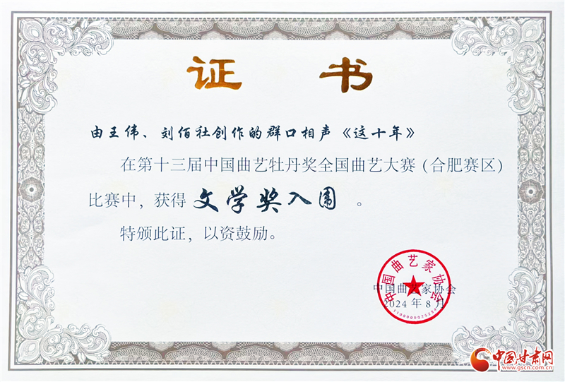 據(jù)了解,中國曲藝牡丹獎(jiǎng),是全國性曲藝藝術(shù)專業(yè)最高獎(jiǎng)項(xiàng)。第十三屆中國曲藝牡丹獎(jiǎng)全國曲藝大賽(合肥賽區(qū)),由中國文學(xué)藝術(shù)界聯(lián)合會(huì)、中國曲藝家協(xié)會(huì)、安徽省文化和旅游廳、安徽省文學(xué)藝術(shù)界聯(lián)合會(huì)、合肥市人民政府主辦,于8月18日至23日舉辦,是本屆牡丹獎(jiǎng)四個(gè)分賽區(qū)中的最后一站,主要面向相聲、小品、“三書”類節(jié)目。中國曲協(xié)18家團(tuán)體會(huì)員、中國曲協(xié)香港會(huì)員分會(huì)、中國曲協(xié)有關(guān)專業(yè)委員會(huì)、中直文藝院團(tuán)以及省級(jí)文藝院團(tuán)報(bào)送的節(jié)目參賽。期間,共收到480多個(gè)節(jié)目,48個(gè)節(jié)目入圍,《這十年》為甘肅地區(qū)唯一一件入圍作品。