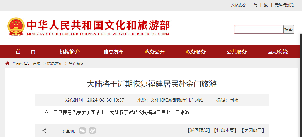 原標(biāo)題:文旅部:大陸將于近期恢復(fù)福建居民赴金門旅游
