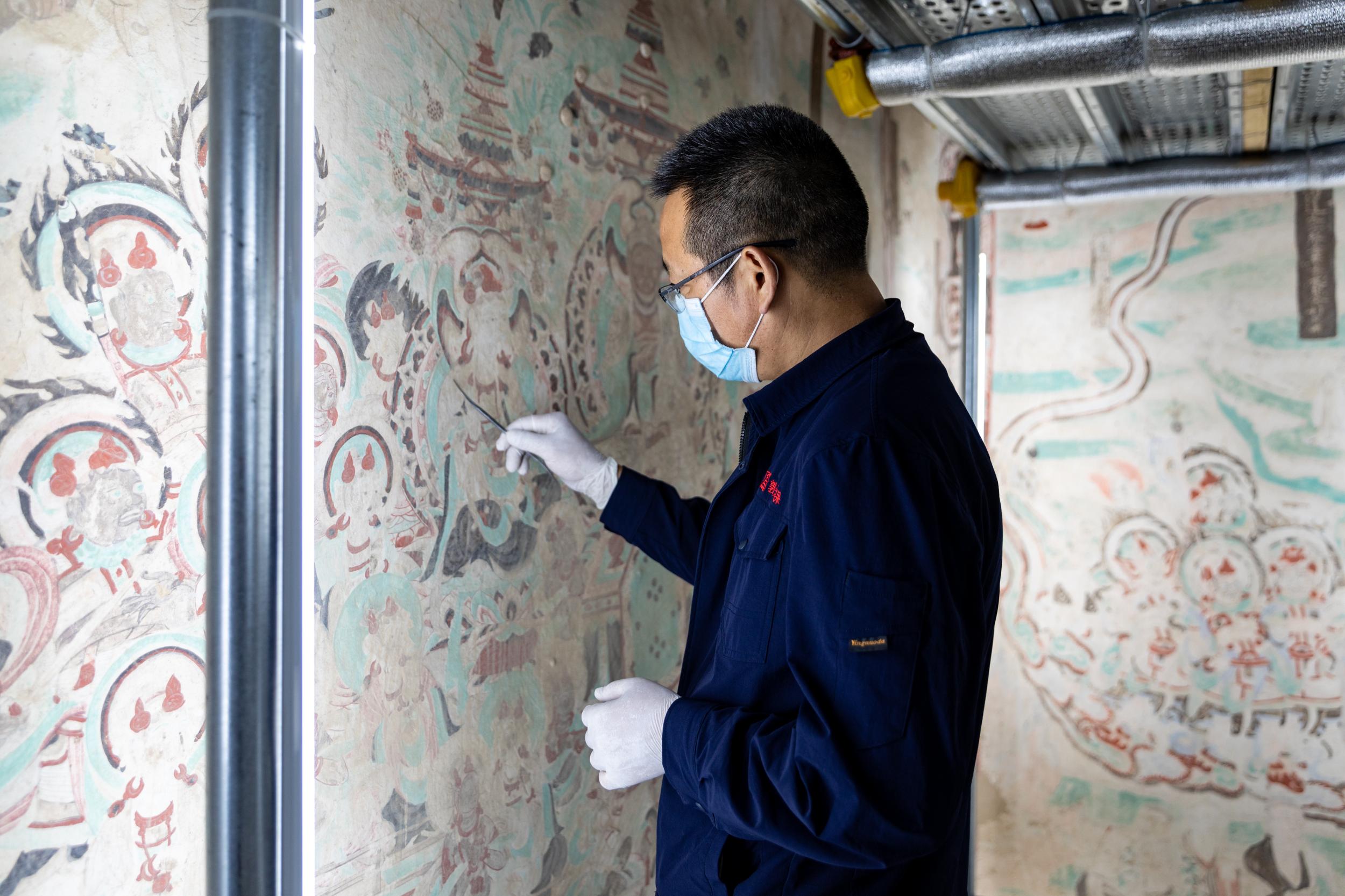 “壁畫比較常見的病害,有酥堿、起甲、龜裂、空鼓等等。”付有旭介紹,其中最為棘手的病害之一,就是素有壁畫“癌癥”之稱的酥堿。其形成過程復(fù)雜,危害較大,最難治理,敦煌研究院的壁畫修復(fù)師們不斷研討方案,采用控制水分和濕度、用自制工具吸附鹽分等方法,因地制宜,才讓酥堿病害得到有效控制。