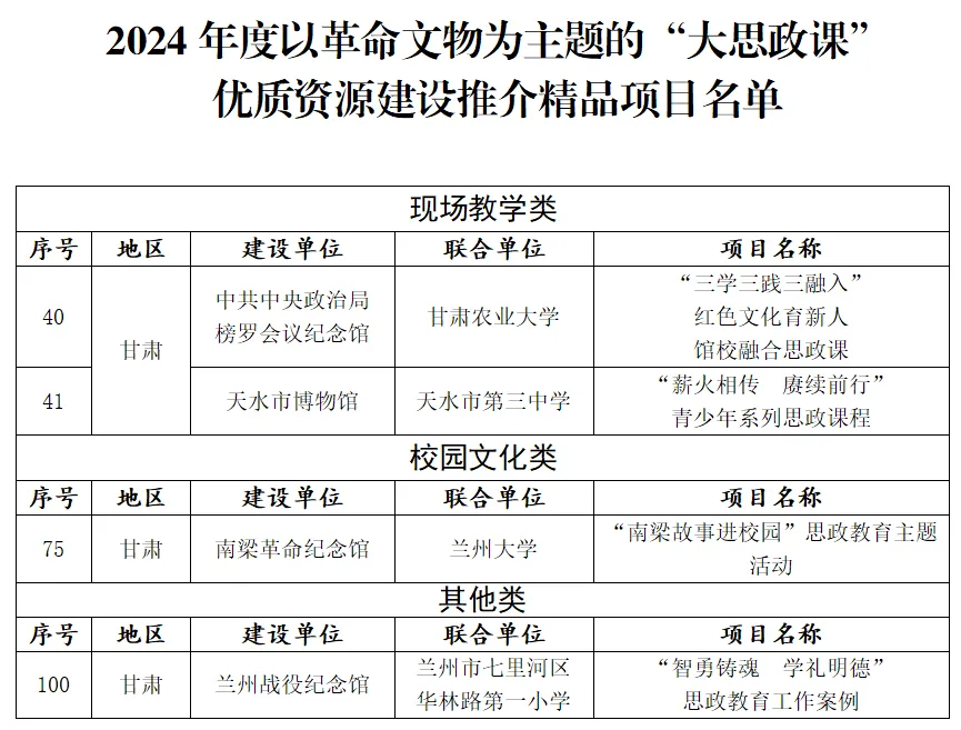 甘肅4項(xiàng)案例入選2024年度以革命文物為主題的“大思政課”優(yōu)質(zhì)資源建設(shè)推介項(xiàng)目名單