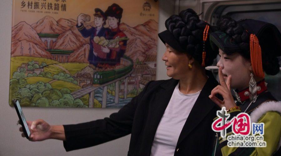 沿途,每當(dāng)列車??吭谲囌镜却臅r間,彝族老鄉(xiāng)在鐵路工作人員的協(xié)同配合下搬起水果,牽起牛羊,抱起雞鴨放進一節(jié)節(jié)行李車廂上,慢火車的貨架上擺滿了農(nóng)產(chǎn)品。車廂里,人們互相交談,圍坐在一起放聲歌唱,好不熱鬧,歡樂的聲音從車廂內(nèi)傳出,像是在向廣袤的山川大地宣告著彝歷新年的盛事。