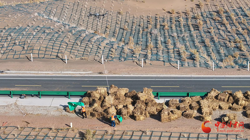 防沙治沙又一季,綠化造林年復(fù)年。這幾天,在金塔縣城至大墩門公路“三北”工程防沙治沙現(xiàn)場,一捆捆稻草正排著隊(duì)乘坐無人機(jī)前往沙漠深處。走進(jìn)壓沙現(xiàn)場,大家拉草埋沙,手提肩扛,或俯身鋪草,或揮鍬壓埋、填沙整型,分工明確、干勁十足。一臺壓沙車正在作業(yè),車輪駛過,稻草沙障便被植入沙漠里,劃線、鋪草、壓草,整個(gè)流程一氣呵成,效率大大提高。