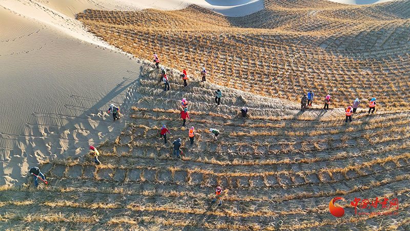 據(jù)了解,金塔縣黑河中游防沙治沙林草綜合治理項(xiàng)目,今年計(jì)劃給1174畝沙漠戴上草方格“圍脖”,工期50天,預(yù)計(jì)需要稻草410噸。隨著治沙進(jìn)度的加快,一個(gè)個(gè)草方格沙障從無到有漸次鋪開,猶如一條條金色的“鎖鏈”,牢牢鎖住沙丘,在茫茫沙海筑起了一道道生態(tài)安全屏障。當(dāng)下正值農(nóng)閑時(shí)節(jié),該項(xiàng)目通過“以工代賑”,改變了傳統(tǒng)做法,通過有償勞動(dòng)讓群眾由治沙的“看客”變?yōu)橹紊车?ldquo;主角”,構(gòu)建起全民參與防沙治沙新格局,實(shí)現(xiàn)治沙致富雙贏,預(yù)計(jì)增加群眾收入3000余萬元。