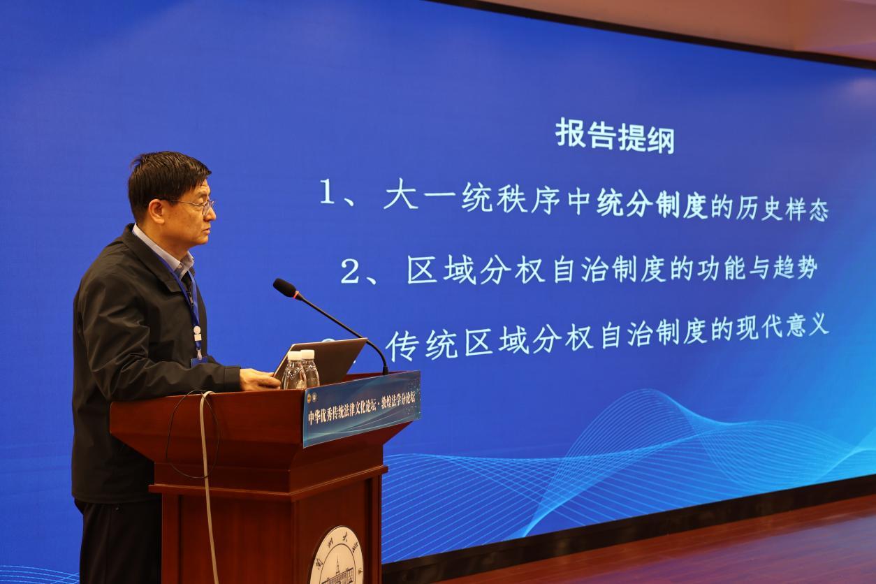中國社會科學(xué)院法學(xué)研究所二級研究員、博士生導(dǎo)師、法制史研究室主任、中國法律史學(xué)會會長、第七屆“全國十大杰出青年法學(xué)家”張生,從大一統(tǒng)秩序中統(tǒng)分制度的歷史樣態(tài)、區(qū)域分權(quán)自治制度的功能與趨勢、傳統(tǒng)區(qū)域分權(quán)自治制度的現(xiàn)代意義等方面作了題為“大一統(tǒng)秩序下的統(tǒng)分制度及其現(xiàn)代意義”的主旨報告。