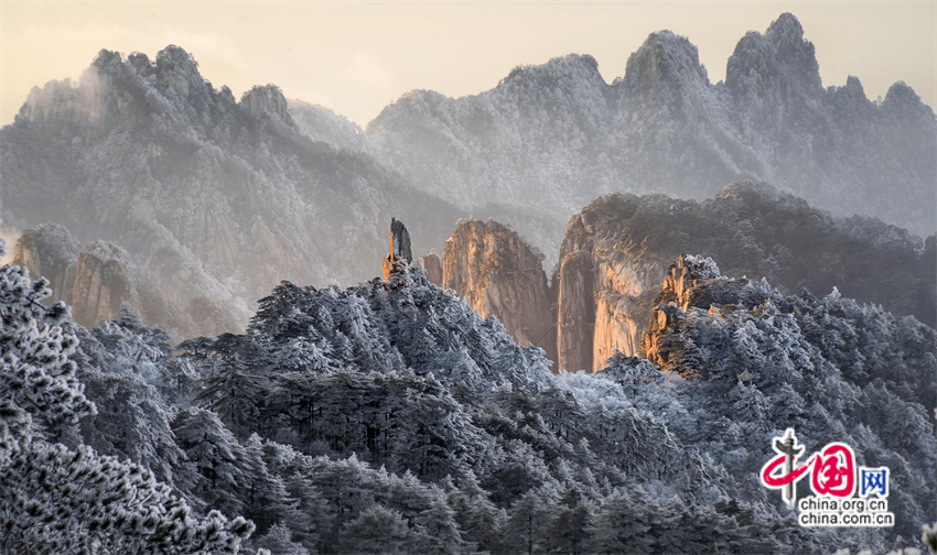 11月25日夜,安徽黃山風景區(qū)迎來入冬首場降雪。26日,雪后初霽,五百里黃山銀裝素裹、分外妖嬈。山峰、奇松、怪石在朝陽的關(guān)愛下披上了一層金色的外衣。松林相間雪花層疊,熠熠生輝,翠色與銀白交織,宛如瓊枝玉樹,讓人流連忘返。