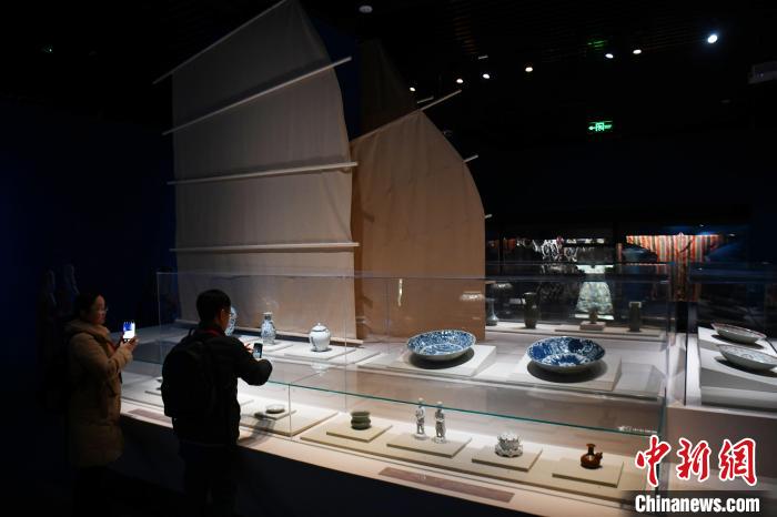 12月21日,“傳奇之旅:馬可·波羅與絲綢之路上的世界”展覽在四川博物院正式面向公眾開(kāi)放。圖為觀眾參觀現(xiàn)場(chǎng)展出的中國(guó)元代青花瓷系列展品?!≈行律缬浾?nbsp;張浪 攝