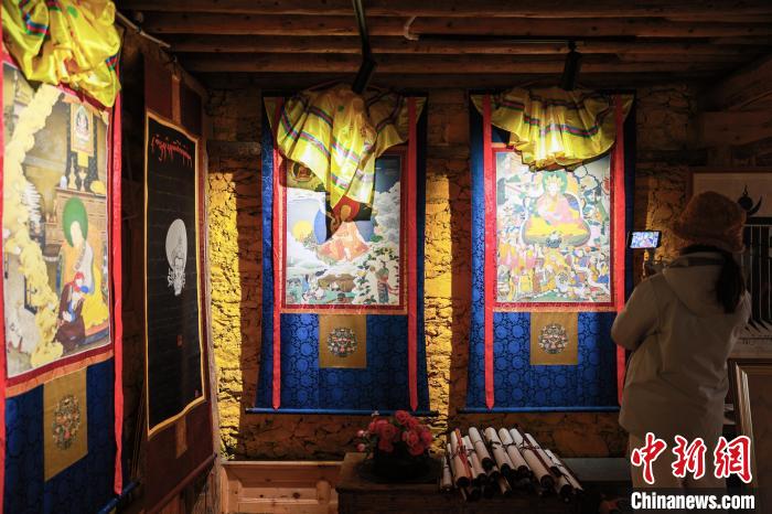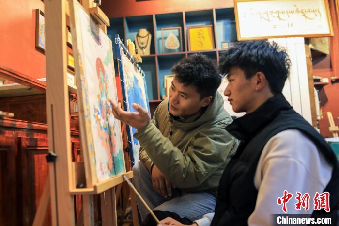 12月22日,在勒通古鎮(zhèn)的“唐卡館”,一位畫師繪制唐卡吸引游客駐足觀看。中新社記者 薛蒂 攝