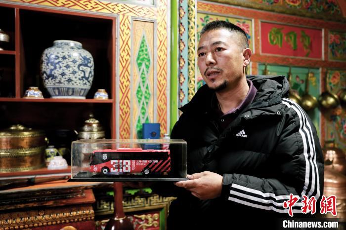 12月22日,藏文書法家昂旺曲批展示收藏的車模型。中新社記者 薛蒂 攝