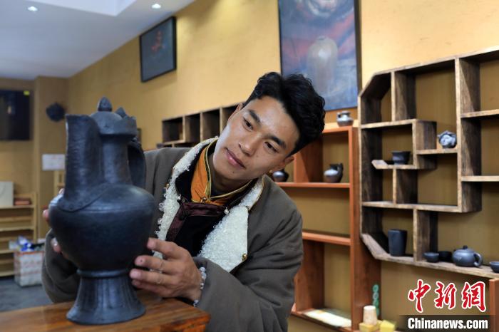12月22日,在勒通古鎮(zhèn)的一家陶藝館內(nèi),陶藝師土登擺放土陶作品。中新社記者 王磊 攝