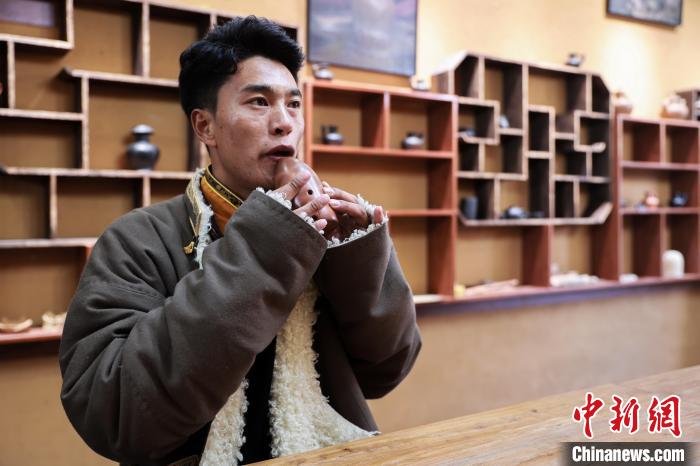 12月22日,在勒通古鎮(zhèn)的一家陶藝館內(nèi),陶藝師土登吹奏土陶制作的塤。中新社記者 薛蒂 攝