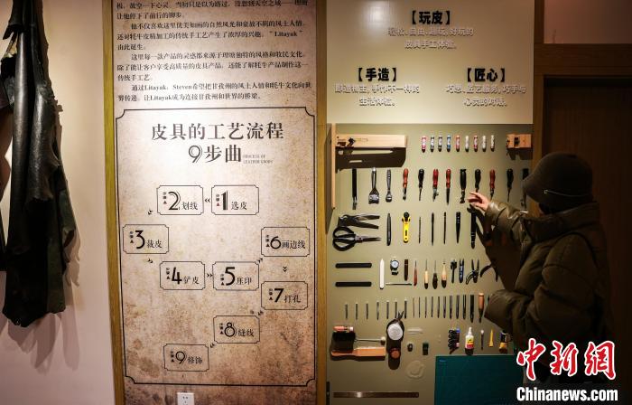 12月22日,在勒通古鎮(zhèn)的一家皮具店內(nèi),游客被掛在墻上的工具所吸引。中新社記者 薛蒂 攝