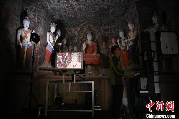 2024年6月5日,甘肅省敦煌市莫高窟內(nèi),敦煌研究院文物數(shù)字化研究所工作人員進(jìn)行敦煌壁畫數(shù)字化采集工作?!≈行律缬浾?nbsp;李亞龍 攝