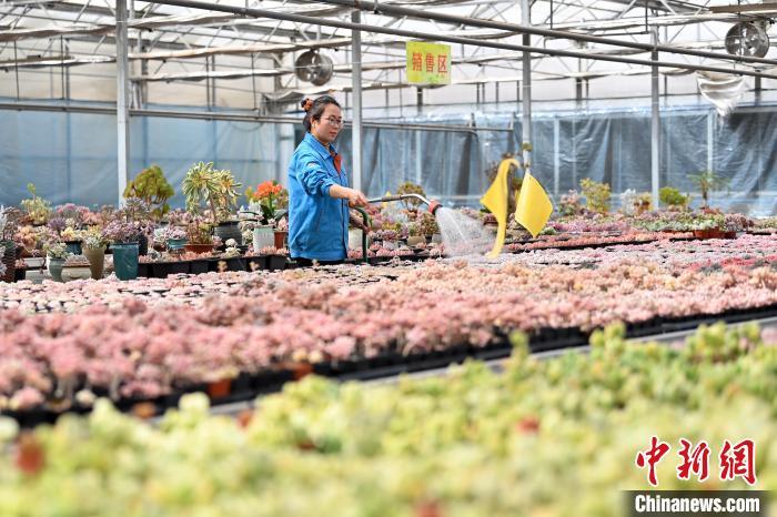 3月12日,在甘肅省蘭州市紅古區(qū)鑫源現(xiàn)代農(nóng)業(yè)科技示范園種植大棚內(nèi),工作人員正在管護(hù)多肉植物。中新社記者 九美旦增 攝