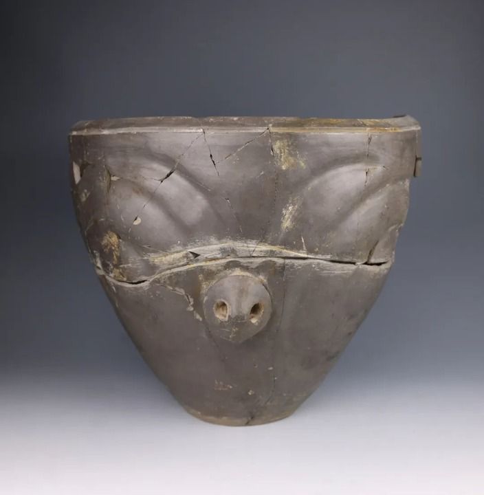 然而,馬家窯人的藝術(shù)創(chuàng)造力似乎遠(yuǎn)不止于此。寺洼遺址新出土的眾多陶器展現(xiàn)出全新的造型與紋飾風(fēng)格。如其中一件帶有“豬鼻”的馬家窯類型泥質(zhì)灰陶,色澤深沉灰黑如夜,一只鼻子自陶胎中緩緩隆起,上方的弧形紋理像舒展的眉骨,又像張開(kāi)的羽翼,一場(chǎng)古文明的夢(mèng)境由此展開(kāi)。