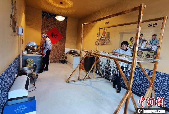 慶陽市合水縣太莪鄉(xiāng)黑木村村民在黑木崖生態(tài)康養(yǎng)農(nóng)莊手工作坊晾曬粉條。(資料圖)安志鵬 攝