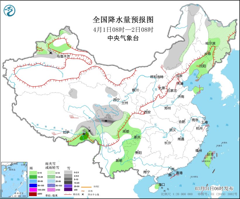 3月31日08時(shí)至4月1日08時(shí),內(nèi)蒙古東北部、黑龍江西北部和東部、吉林東部、新疆沿天山地區(qū)、西藏東部、青海南部、川西高原北部等地部分地區(qū)有小到中雪或雨夾雪,其中,川西高原北部等地部分地區(qū)有大雪(5~9毫米)。西藏東南部、西南地區(qū)東部、江南南部和東部、華南中東部、臺(tái)灣島等地部分地區(qū)有小到中雨,其中,臺(tái)灣島北部等地部分地區(qū)有大到暴雨(50~70毫米)。西藏南部、青海西部、內(nèi)蒙古東部、遼寧中南部、山東半島、浙江東部等地部分地區(qū)有4~6級(jí)風(fēng),西藏東部部分地區(qū)有8~9級(jí)風(fēng);渤海、渤海海峽、黃海北部、東海大部、臺(tái)灣海峽、臺(tái)灣以東洋面、巴士海峽、南海中北部海域有6~7級(jí)風(fēng),陣風(fēng)8級(jí)。