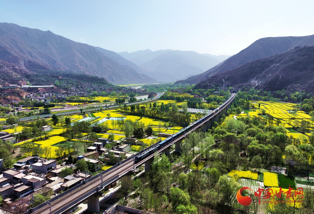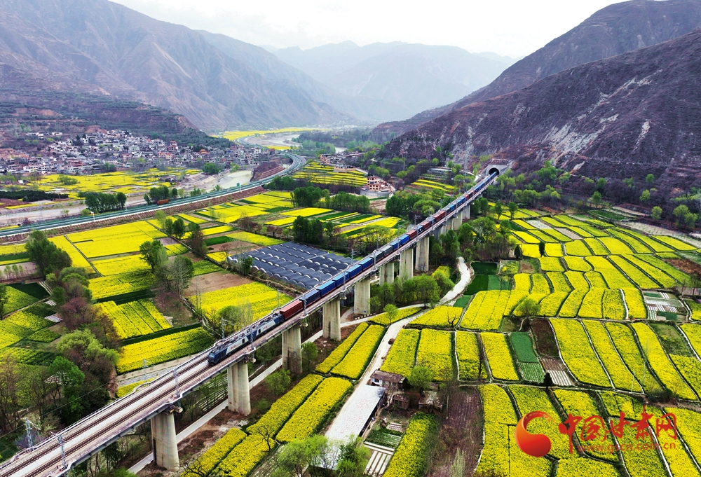 4月10日,列車在蘭渝鐵路宕昌縣沙灣鎮(zhèn)段附近行駛,穿行于花海之間?,F(xiàn)代交通動(dòng)脈與原始鄉(xiāng)野在此默契共生,火車轟隆駛過(guò),為春日畫(huà)卷增添了別樣的景致。