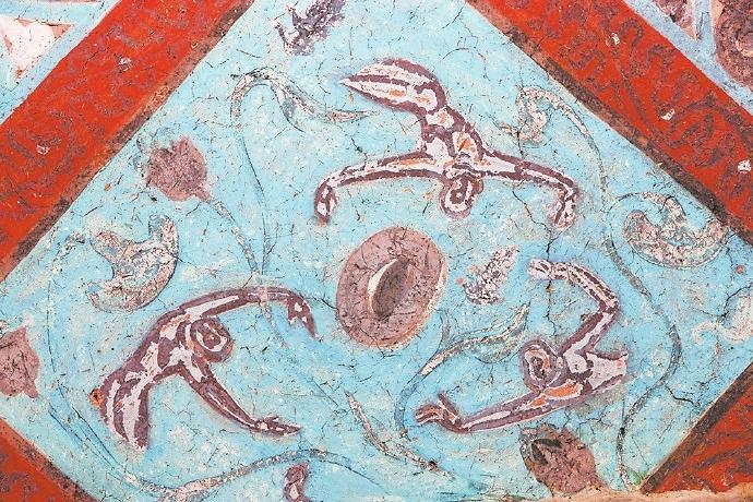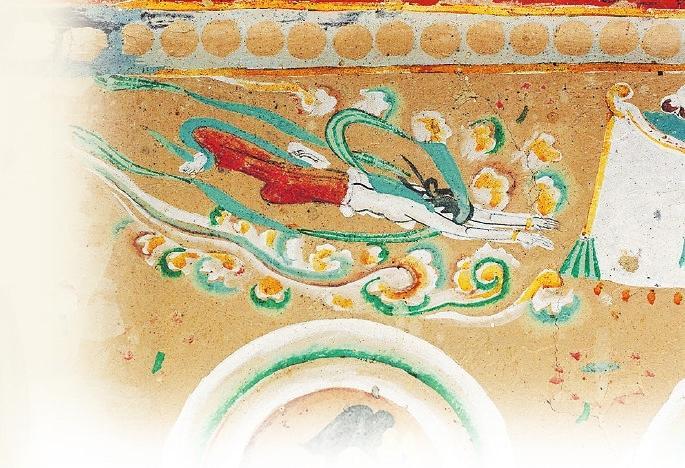 在許多人的認(rèn)知里,飛天是唯美曼妙的化身。在敦煌的許多壁畫中有大量的飛天形象,但是你知道嗎?在這些壁畫中除了凌空飛躍的飛天外,還有不少水中的飛天。在莫高窟第329窟壁畫中有一幅“潛水式飛天圖”:畫面中的一位飛天身著赭紅色長裙,藍(lán)色飄帶纏身,雙手伸展前伸,似乎正在水中遨游。畫面唯美而靈動(dòng),在曼妙中透著健碩,使人過目難忘。