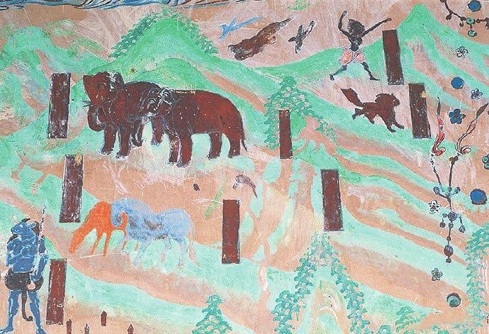 另外,莫高窟第85窟壁畫中還有一幅“行獵圖”形象地反映了狩獵的情景:畫面上四個(gè)健碩的獵人正在整裝出獵,他們著裝統(tǒng)一:頭戴幞頭,身穿缺胯衫,足蹬半腰靴。有人胳臂上駕鷹、有人單手牽犬、有人持弓挎箭囊,甚至還有一人手持利斧。